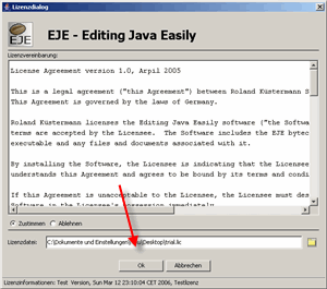 Wenn Sie EJE das erste Mal starten müssen Sie die Lizenzdatei angeben. Bestätigen Sie hier das Lizenzabkommen zu EJE und geben Sie dann den Ort der Lizenzdatei an. Wählen Sie OK, um EJE zu starten. |