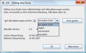 In dem geöffneten Fenster können Einstellungen der regelmäßigen Aktualisierungen vornehmen. Je nach dem welche Variante gewählt wird, verwendet EJE die momentan aktive Internetverbindung, um nach neuen Programmversionen zu suchen und diese entsprechend anzukündigen. Damit dieser Vorgang funktioniert muss zuvor eine Internetverbindung bestehen. EJE informiert darüber, wenn es keine Verbindung herstellen kann. |