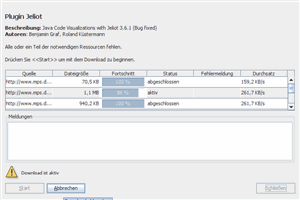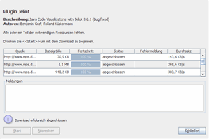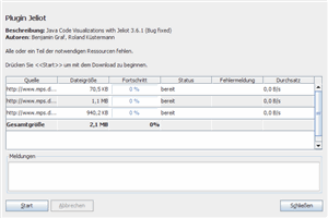 Wenn neue Plugins oder neue Versionen eines Plugins verfügbar sind (nicht automatisch!), so wird der Download Dialog angezeigt. Dieser stellt die herunterzuladenen Dateien in einer Liste dar. Mit einem Klick auf den Schalter wird der Download-Prozess gestartet.Sollten das Herunterladen wider Erwarten selbstständig abbrechen, so können Sie diesen einfach durch einen erneuten Klick auf den -Schalter wiederholen. |