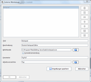 Parameter | Geben Sie hier die anwendungspezifischen Argumente an (Standard: aktuelle Datei). Sie können direkt auf die im aktuellen Fenster geöffnete Datei zugreifen. Verwenden Sie dazu die hier definierten Variablen . |