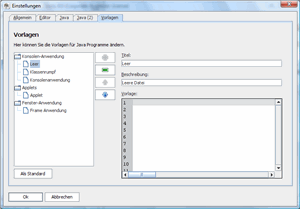 Vorlagen dienen zur Vereinfachung der Programmierarbeit. Sie setzen aber voraus, dass das, was als Vorlage mitgeliefert wird, auch verstanden wird. Daher ist standardmäßig die leere Vorlage aktiviert, so dass der Anfänger zunächst alles selber schreiben muss. Dem erfahreneren Programmier empfehlen wir die Anpassung und Verwendung der Vorlagen.